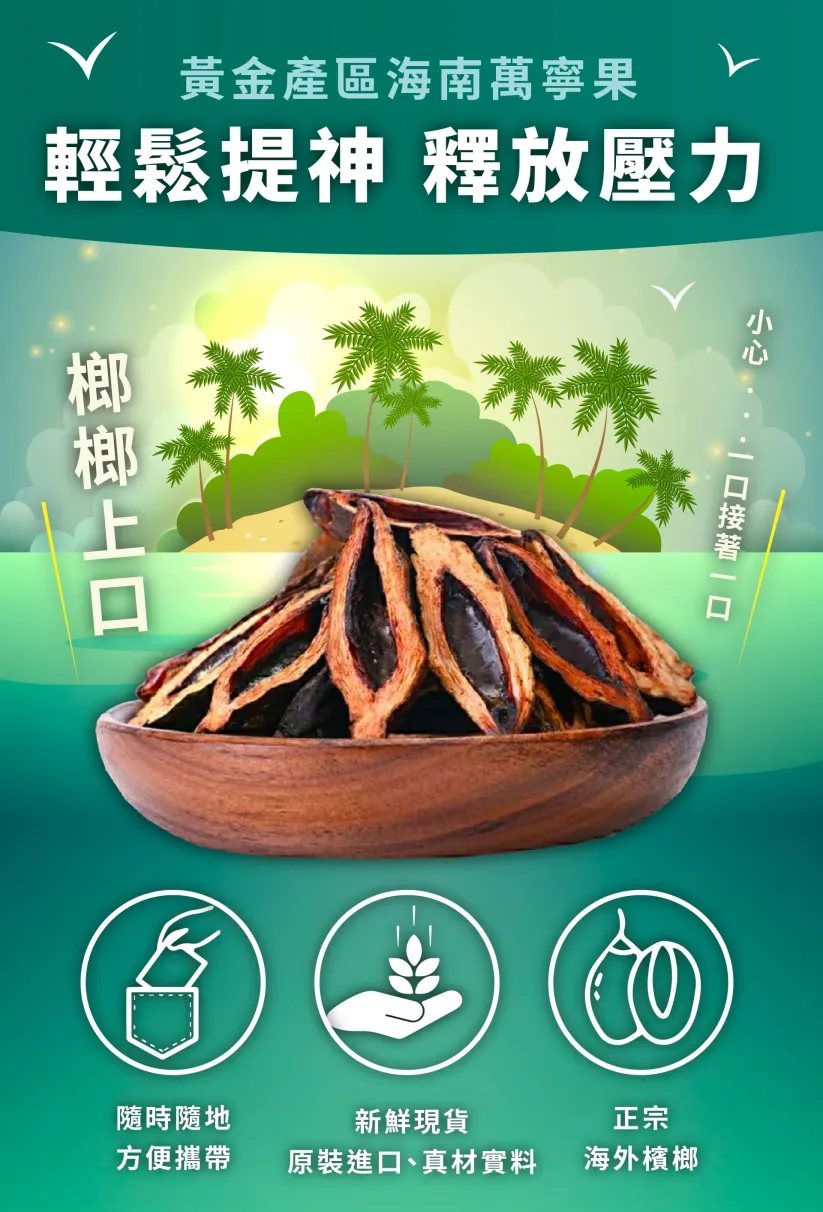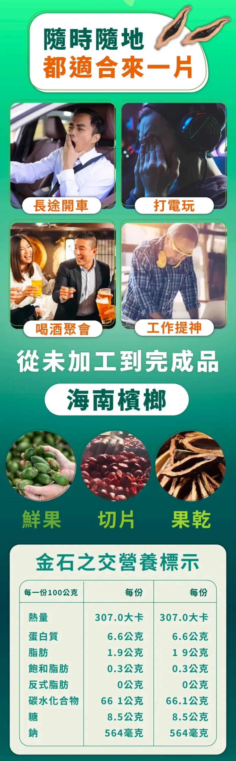 主要成分:檳榔烘製白果、水、麥芽糖、白砂糖、紅棗醬、羅漢果粉、植物油、 雞精調味料、味精、酸水解植物蛋白調味粉、甘油、碳酸氫銨、檸檬酸、明膠、甜蜜素、糖精鈉、甜菊糖苷、羅漢果甜苷、甘草酸一鉀、甘草酸銨、三氯蔗糖、阿斯巴甜、紐甜、愛德萬甜、苯甲酸鈉、山梨酸銨。